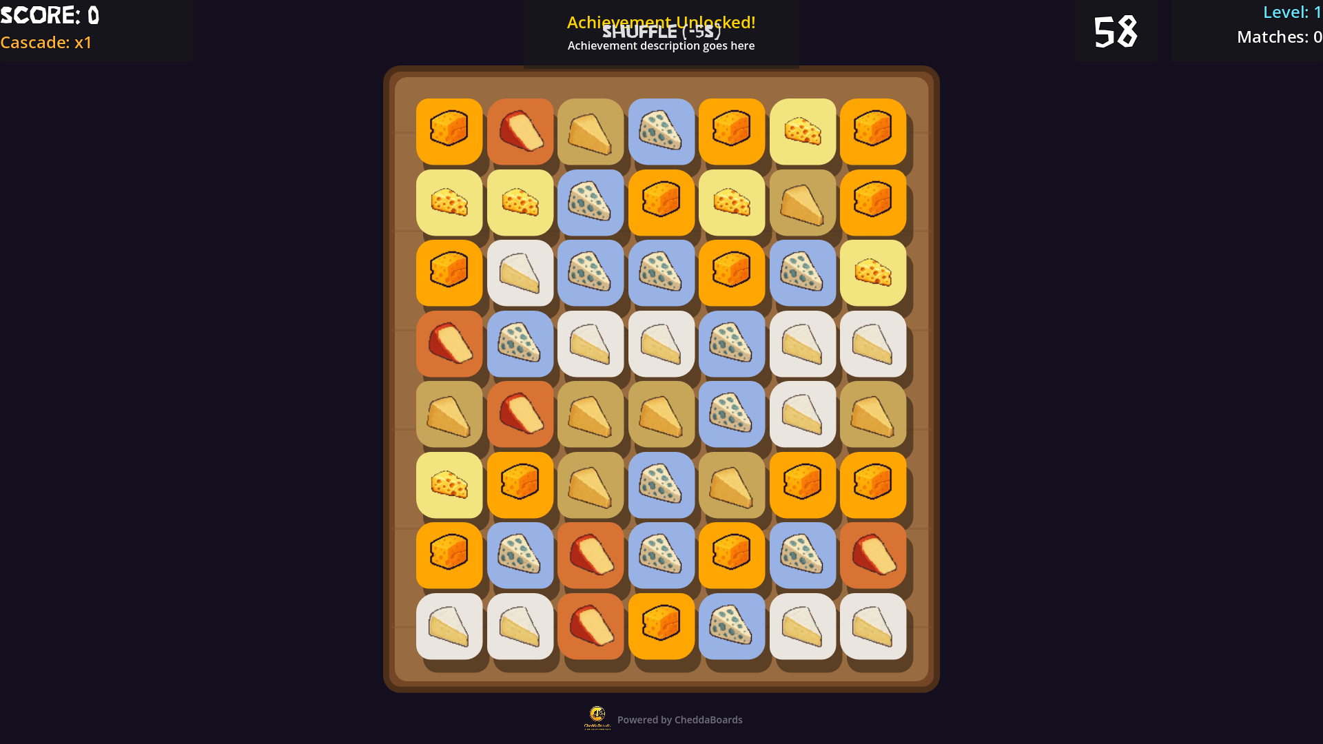 A satisfying match-3 puzzle game where you swap cheese tiles to create cascading combos. Build powerful power-ups and race against the clock!